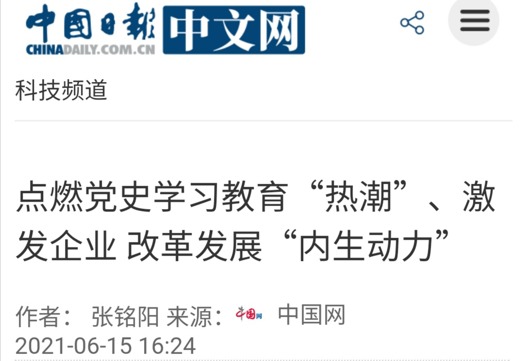 中國日報網:點燃黨史學習教育“熱潮”、激發企業 改革發展“內(nèi)生(shēng)動力”