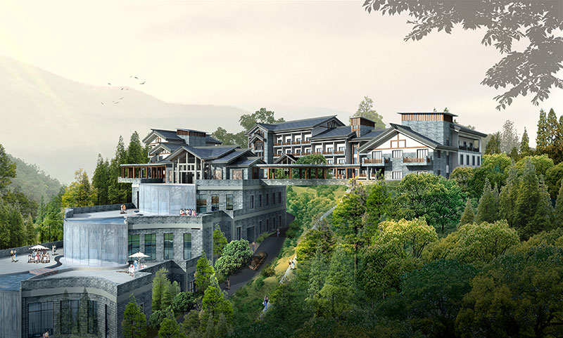 總平面的布局既像一隻頭朝靈芝泉的神鳥又似一隻頭朝東方爬行(xíng)的神龜,隐喻南嶽的壽文化。外觀采用傳統的建築形式和(hé)地方材料(木材、石材)。主體(tǐ)建築以灰、白、原木三色為(wèi)主基調,白牆與灰色石闆牆穿插組合,與青灰屋面及綠色平台形成清新的建築外形。從外形到細部都充分吸取湖(hú)南傳統建築精華,凸顯湖(hú)湘地域特色。