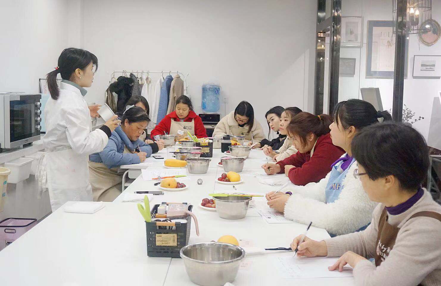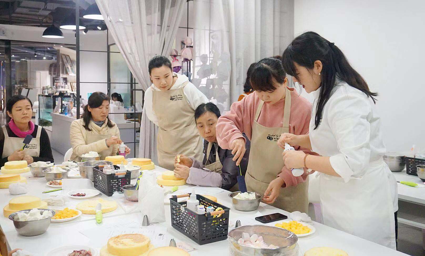 活動現場(chǎng)中,烘焙工具和(hé)原材料一應俱全,女職工們個(gè)個(gè)都興奮不已,躍躍欲試。在兩位烘焙老師(shī)的細心授教下,大(dà)家(jiā)撸起袖子,系上(shàng)圍裙,開(kāi)始盡情發揮自己的創造力和(hé)想象力。有(yǒu)的切水(shuǐ)果裝盤,有(yǒu)的制(zhì)作(zuò)奶油,有(yǒu)的切蛋糕坯子,有(yǒu)的認真挑選自己中意的鮮花(huā),忙得(de)不亦樂乎,場(chǎng)面十分熱鬧。