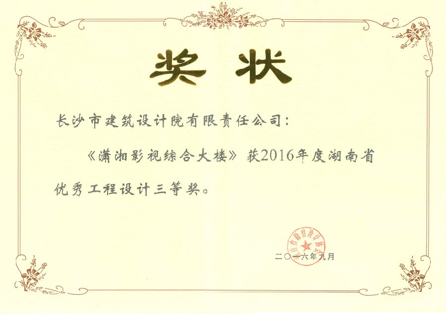 2、《潇湘影(yǐng)視(shì)綜合大(dà)樓》項目榮獲湖(hú)南省優秀工程設計(jì)三等獎。