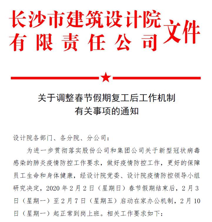 二是調整複工安排,堅持科學防控。為(wèi)有(yǒu)效應對新型冠狀病毒感染的肺炎疫情,做(zuò)好疫情防控工作(zuò),設計(jì)院緊急調整春節假期複工後工作(zuò)機制(zhì),假期結束後2月3日(農曆初十)開(kāi)始啓動在家(jiā)辦公機制(zhì),非必須到崗處理(lǐ)的事務一律采取值班制(zhì)處理(lǐ),值班落實到人(rén)。同時(shí),對複工後外地返崗人(rén)員作(zuò)出自我隔離一定天數(shù)要求,并摸底統計(jì)返程情況,複工後疫情未得(de)到有(yǒu)效控制(zhì)前派工作(zuò)人(rén)員到疫情嚴重區(qū)域出差的須審批報備。